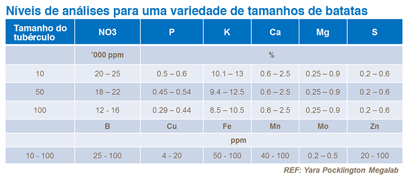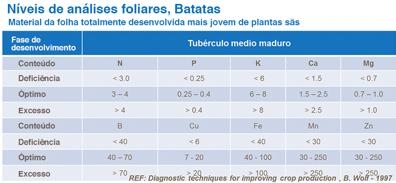 As análises de tecido vegetal (pecíolo ou folha inteira) efetuadas durante a temporada de desenvolvimento proporciona um relatório mais exato sobre o estado nutricional e a probabilidade de distúrbios nutricionais ou carências, sobretudo de micronutrientes. Consulte as tabelas abaixo: